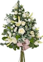 Photo non contractuelle | Gerbe piquée blanche Gerbe piquée blanche à base de fleurs de saison sur luxuriant feuillage - Env. 40 cm