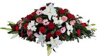 Photo non contractuelle | Desssus de cercueil pastel Dessus de cercueil couvrant avec fleurs de saison pastel - Env. 160 cm - Ruban inclus avec 50 caractères max -