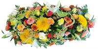 Photo non contractuelle | Dessus de cercueil coloré Dessus de cercueil avec fleurs de saison colorées - Env. 100 cm - Ruban inclus avec 50 caractères max -