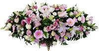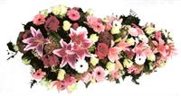 Photo non contractuelle | Desssus de cercueil pastel Délicat dessus de cercueil avec fleurs de saison pastel - Env. 120 cm - Ruban inclus avec 50 caractères max -