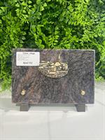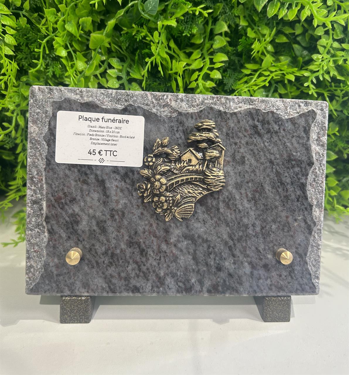 Plaque funéraire Dimension : 12.5*18 cm Granit : Mass Blue Bord éclaté Bronze : Village Possibilité de la personnaliser en mettant un Inter