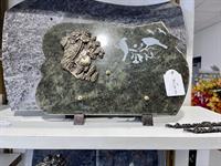 Granit : Himalaya Blue -Inde, Dimension : 40*30cm, Fixation : Pieds, Bronze : Colombe et branche d'olivier, Emplacement de deux inters au choix