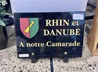Plaque rectangulaire Granit : Noir Absolu Taille : 20*30 cm Socle : Fixe Motif : Logo Rhin et Danube ( Peinture artistique ) Gravure : A notre camarade ( Or 22 carats )