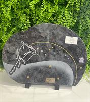 Granit : Labrador Blue Dimension : 25*35cm Fixation : Pieds en Bronze Gravure : Blanc et Or 22 carats plus véritable pierre Swarovski Emplacement de deux inter au choix