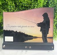 Matière : Plexiglas, Forme : Vague, Image Fond : Pêche, Dimension : 24*18cm Fixation : Socle Granit Noir absolu, Emplacement d'un inter au choix