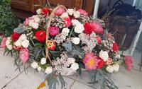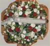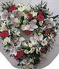 Photo non contractuelleDESSUS DE CERCUEIL LONGUEUR 120 CM AVEC ROSES ROUGES ET FLEURS BLANCHES