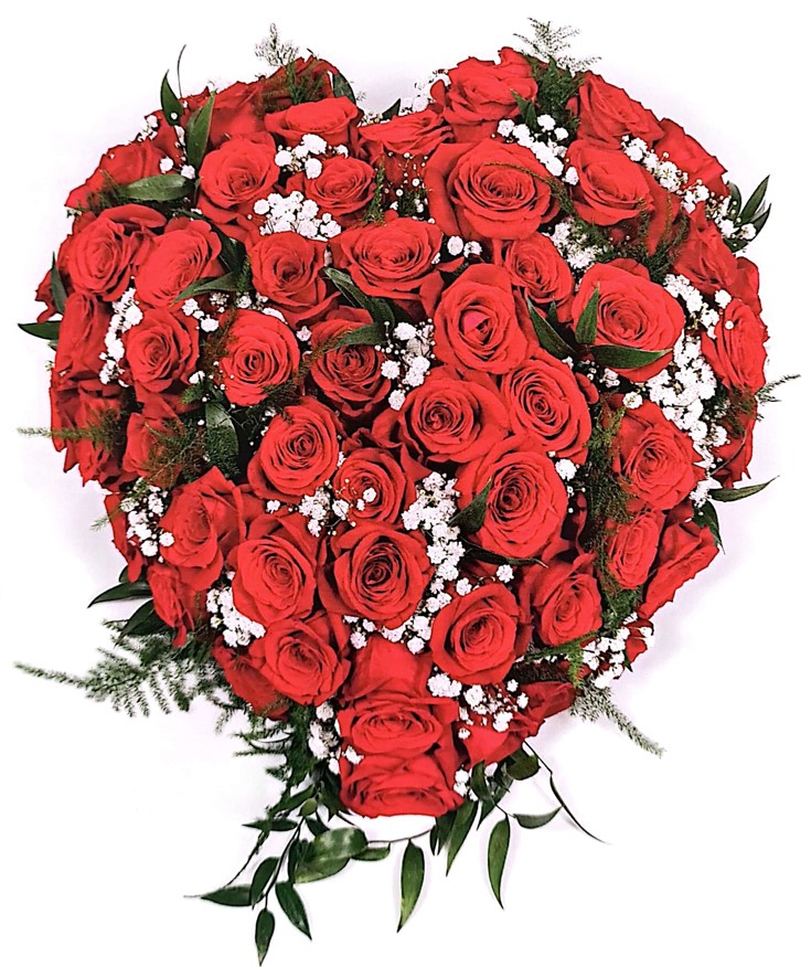 Photo non contractuelle | Coeur fleuri roses rouges et gypsophiles Coeur de fleurs de saison rouge ou autres couleurs - Diamètre 40 cm