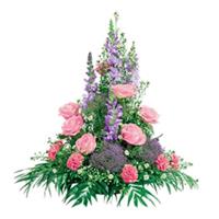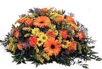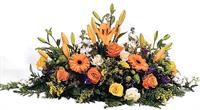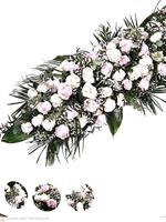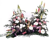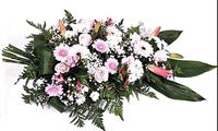 Photo non contractuelle | Devant de tombe long H 60 - L 90 cm Ce devant de tombe long se compose de roses, mufliers, lisianthus, gerberas, alstroémérias et statices ou autres couleurs ou autres couleurs. ( Fleurs de saison )