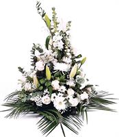 Photo non contractuelle | Gerbe piquée - Grand modèle Toutes les compositions sont disponibles en différents coloris : Blanc / Rouge / Jaune & orange / Rose & violet ou autres couleurs. ( Fleurs de saison )