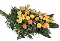 Photo non contractuelle | Gerbe à la main largeur 90 cm Ce bouquet dans la longueur se compose de germinis, alvéolés, lys, roses, solidagos et aspidistras ou autres couleurs ou autres couleurs. ( Fleurs de saison )