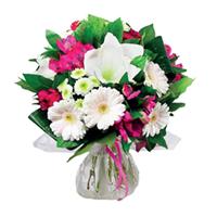 Photo non contractuelle | Gerbe 90 cm Composition dans les tons de roses se compose de lys, gerberas, roses, giroflées et statices ou autres couleurs. ( Fleurs de saison )