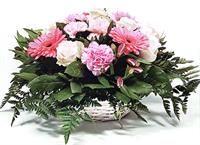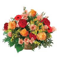 Photo non contractuelle | Panier fleuri 40 cm Panier fleuri composé de roses, gerberas, oeillets et alstroémérias accompagnés de feuillage et de son panier ou autres couleurs. ( Fleurs de saison )