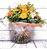 Photo non contractuelle | Gerbe tons orangés 90 cm Cette composition dans les tons orangés se compose de lys, roses, oeillets, giroflées, lisianthus et solidagos ou autres couleurs. ( Fleurs de saison )