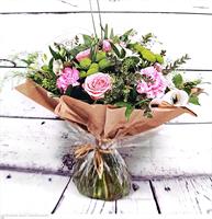 Photo non contractuelle | Gerbe à la main 90 cm tons roses et blanc Ce bouquet dans la longueur se compose de roses, alstroémérias, lys et aspidistras ou autres couleurs. ( Fleurs de saison )