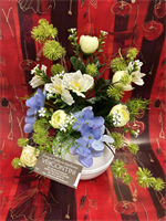 Composition en fleurs naturelle en forme trio de fleurs ( 110/60 cm), avec soit une dominante de Rouge, ou Rose, ou Blanc, merci de nous préciser Disponible sur commande la veille pour le lendemain sauf accord de notre partenaire pour délais plus court.