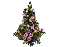 | Devant de tombe rose Devant de tombe avec roses et boutons, lys, delphiniums, cymbidiums et dahlia - Tonalité rose - Dimensions L 69 x l 38 x H 63 cm - Possibilité de rajouter option ruban (texte à préciser lors de la commande) -