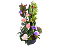 | Devant de tombe lavande Devant de tombe avec roses, orchidées, pierre mousse et spirale aluminium dans support lesté - Tonalités lavande et rose - Dimensions L 75 x l 43 x H 74 cm - Possibilité de rajouter option ruban (texte à préciser lors de la commande) -