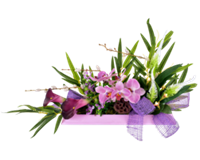 | Plateau rectanguaire lavande Plateau rectangulaire ultraplat avec phalaenopsis, arums,véronique et bambou dans contenant lesté - Coloris lavande - Dimensions 65 x 18 cm et H 33 cm -