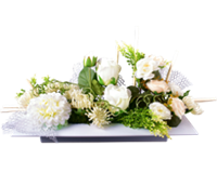 | Composition ultra-plate crème Composition ultra-plate avec roses et boutons, dahlias, gardénias, baies, fil laiton, mazzo et osier blanc dans support lesté - Tonalités crème, blanc et vert - Dimensions 39 x 17 et H 42 cm -