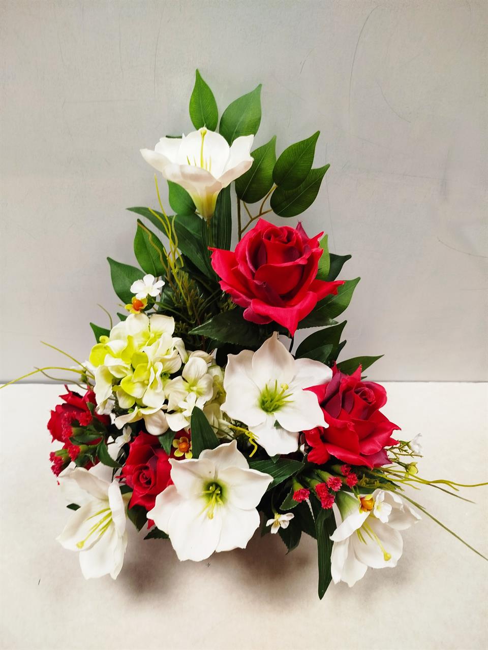 Mélange de fleurs artificielles dans les tons rouges et blancs.