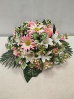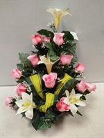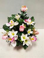 Potée en fleurs artificielles, mélange de roses rose et de lys.