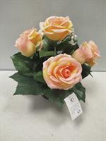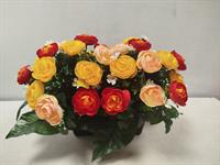 Potée de roses artificielles dans les tons orangés et jaunes.