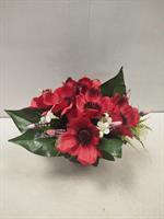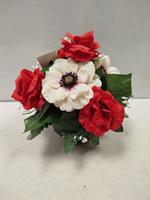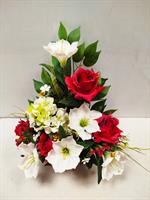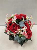 Potée de fleurs artificielles dans les tons rouges et blancs.