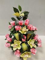 Potée artificielle de roses et camélias.