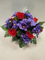 Jardinière en fleurs artificielles, mélange de pensée violettes et roses rouges.