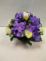 Potée mélange de violettes et roses jaunes.