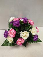 Potée de roses violettes, roses et blanches.