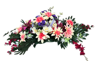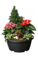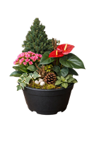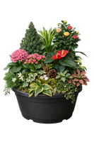 Composition de plantes vertes et fleuries de saison, idéale pour fleurir les espaces de recueillement au cimetière et prolonger le souvenir. Possibilité d'y ajouter un ruban deuil avec une inscription personnalisée. Photo illustrative.