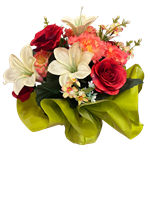 Bouquet avec bulle lestée aux tons rouge et crème.