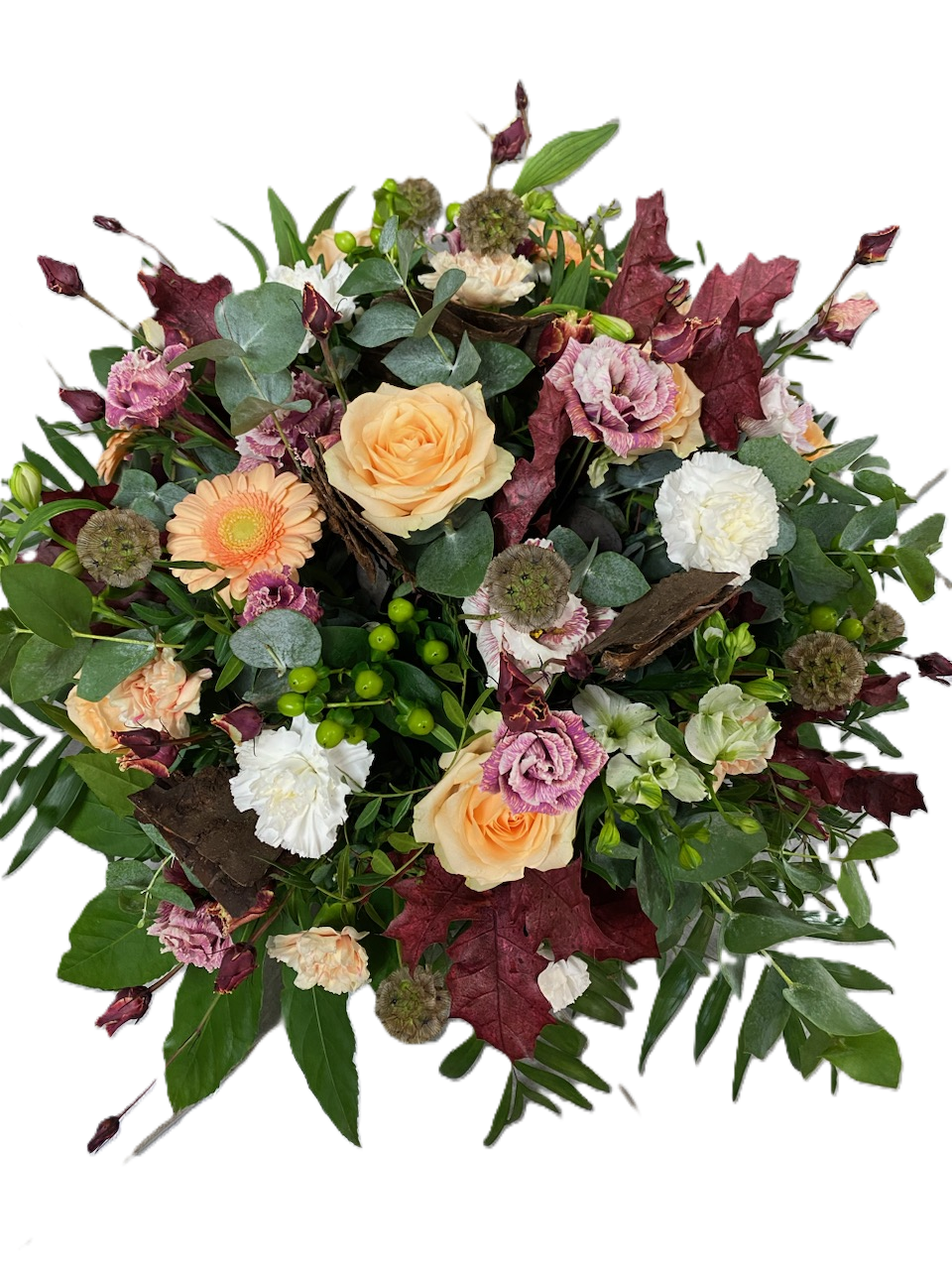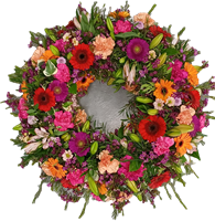Photo for illustration purposes only | Couronne Parméa Couronne composée de fleurs de saison: roses parmes, gerberas colorés, orchidées et son magnifique feuillage. Diamètre env. 50 cm