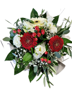 Photo for illustration purposes only | Couronne Elégance Couronne Elégance composée de fleurs de saison: roses rouges et blanches, lys, gerberas et son magnifique feuillage. Diamètre env. 50 cm