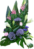 Photo for illustration purposes only | Devant de tombe Sillage Devant de tombe dans les tons de rose et blanc avec rose, gerberas, lys et autres fleurs de saison. Longueur environ 80 cm.