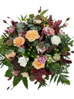 Photo for illustration purposes only | Coussin rond Souffle Floral Coussin composée de fleurs de saison dans des tons saumonée blanc, vert agrémenté de feuillage.