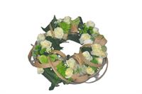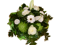 Photo for illustration purposes only | Gerbe Blancé Gerbe piquée de fleurs de saison dans les tons blanc et vert. Longueur 70 cm env.