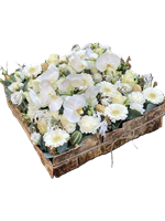 Photo for illustration purposes only | Dessus de cercueil Blancora Dessus de cercueil dans les tons blanc et vert avec des fleurs de saison telles que des lys, des roses… Longueur 90 cm env.