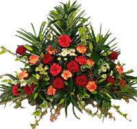 Photo for illustration purposes only | Coussin Eclat Coussin rond dans les tons éclatants rouges composé de roses, gerberas et chrysanthèmes ou autres fleurs de saison avec feuillage. Diamètre env. 50 cm